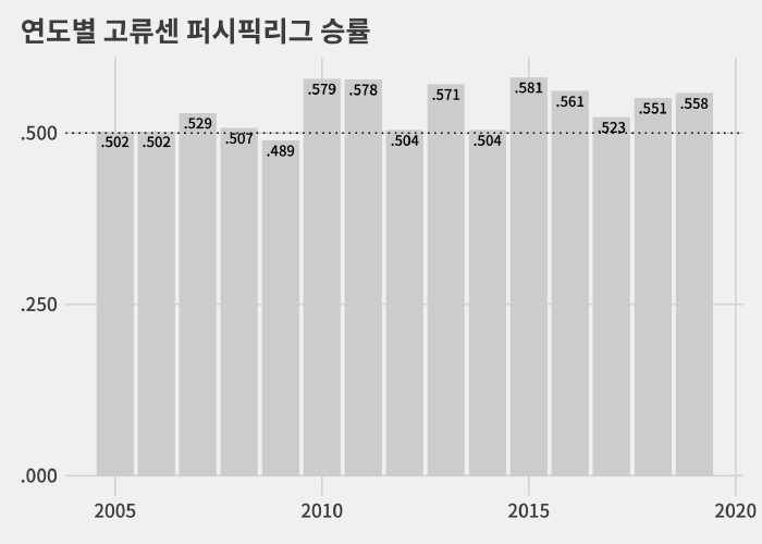 고류센에서 퍼시픽리그가 센트럴리그에 뒤진 건 2009년(승률 .489·67승 7무 70패) 한 번뿐입니다.