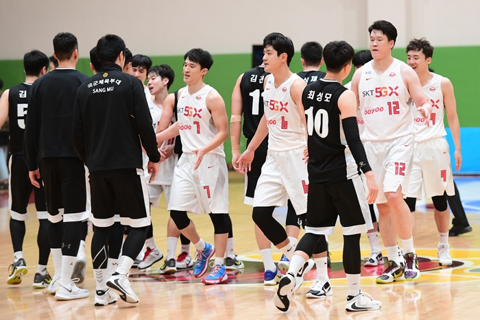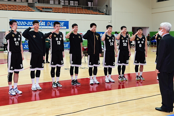 경기를 앞두고 경례하는 상무 선수단. 한국농구연맹(KBL) 제공
