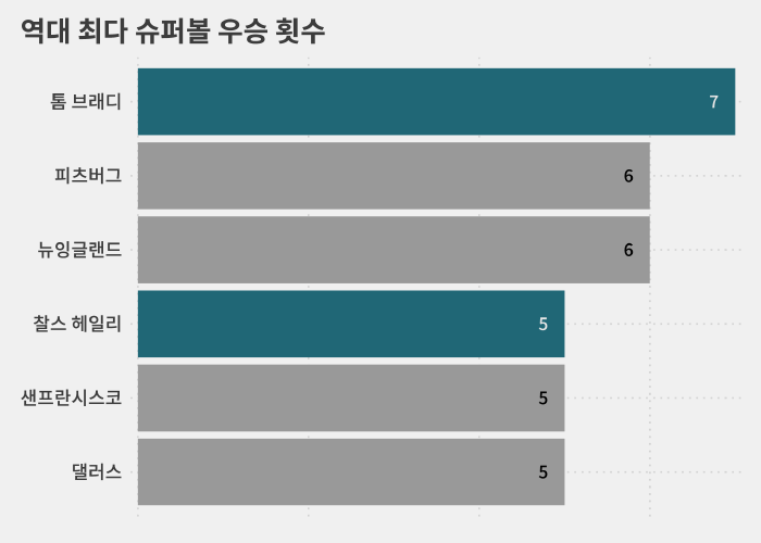 이날 전까지는 브래디와 본인이 여섯 차례 슈퍼볼 정상으로 이끈 뉴잉글랜드 그리고 피츠버그가 여섯 번으로 공동 1위였습니다.