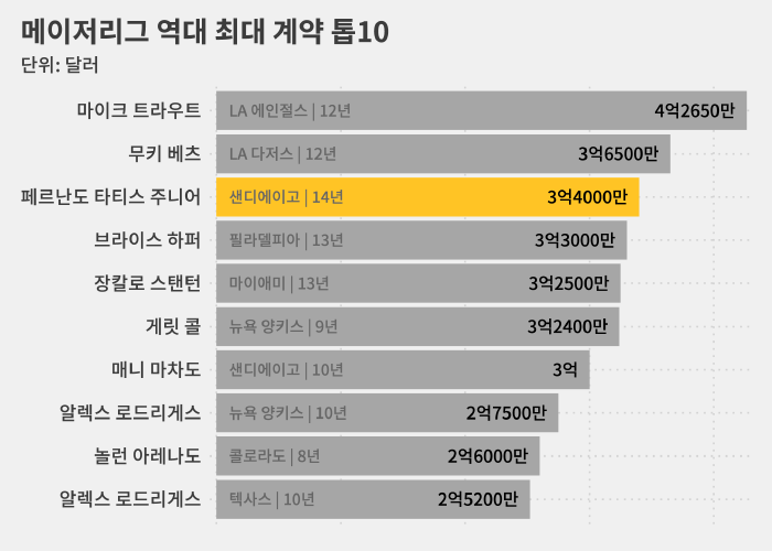 이전까지 브라이스 하퍼(29), 장칼로 스탠턴(32)이 13년 계약을 맺은 적이 있었지만 14년은 타티스 주니어가 처음입니다.