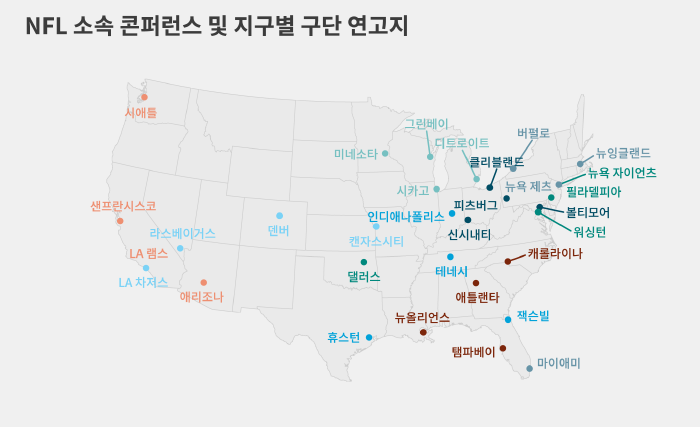 또 상대팀 소속 지구도 다양하다는 사실을 알 수 있습니다. 상대팀을 소속 콘퍼런스와 지구에 따라 정리하면 아래와 같습니다.