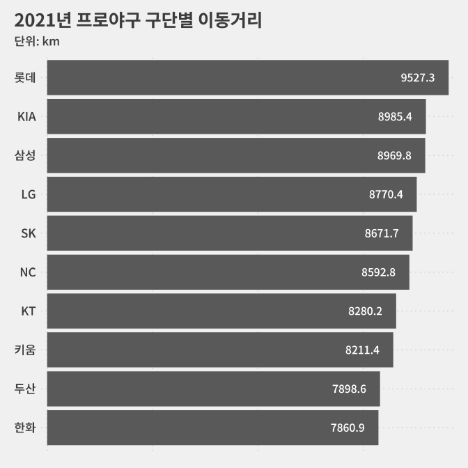 아, 올해 가장 먼 거리를 이동해야 하는 팀은 롯데(9527.3㎞)입니다.