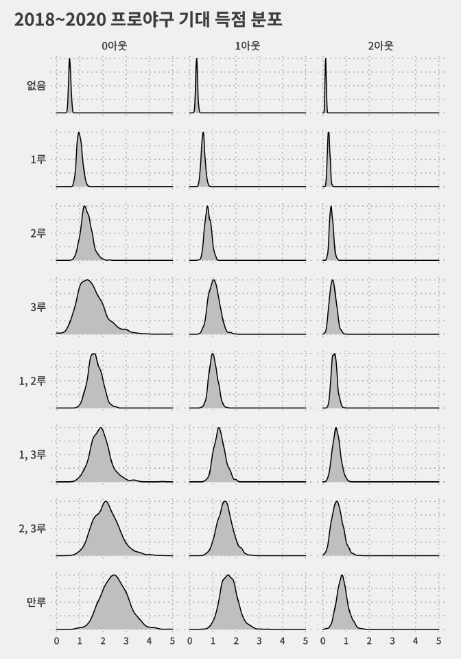 이런 표가 있으면 각 아웃 카운트와(=3가지) 주자 상황(=8가지)에서 시작해 이닝이 끝날 때까지 '평균적으로' 몇 점이나 뽑았는지를 확인할 수 있습니다.