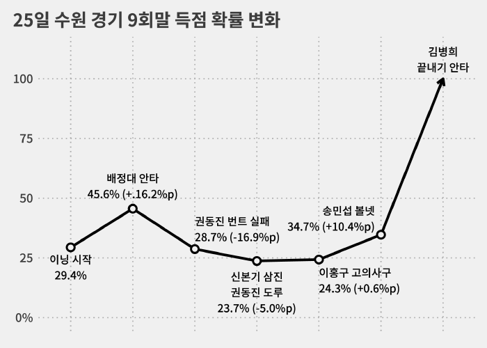 그러면 같은 상황에서 득점 확률 변화를 그래프로 그리면 어떤 결과가 나타날까요?