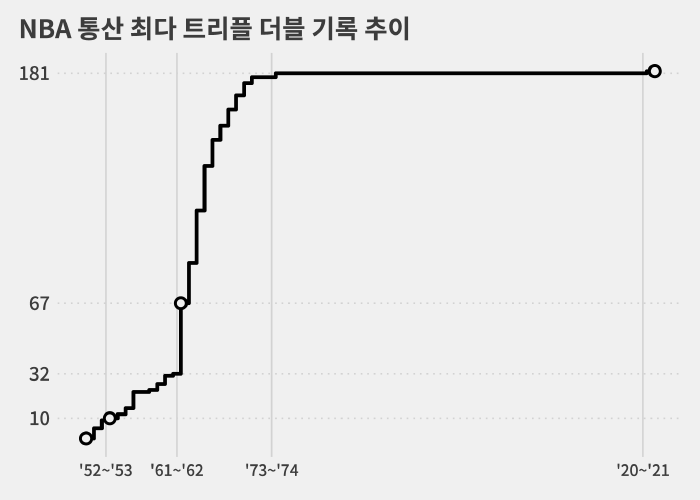 당시 통산 최다 트리플 더블 1위 기록이 32회였는데 한 시즌 만에 이 기록을 턱 밑까지 추격한 겁니다.