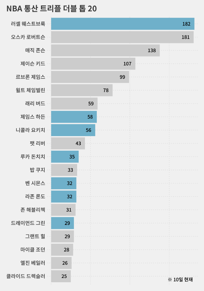 웨스트브룩은 이로써 시즌 36번째이자 통산 182번째 트리플 더블 기록을 남기면서 NBA 통산 최다 트리플 더블 1위로 올라섰습니다.
