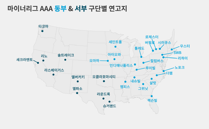 그러다 메이저리그 사무국에서 마이너리그 구조 재편을 진행하면서 AAA를 동부(20개 팀)와 서부(10개 팀)로 나눴습니다.