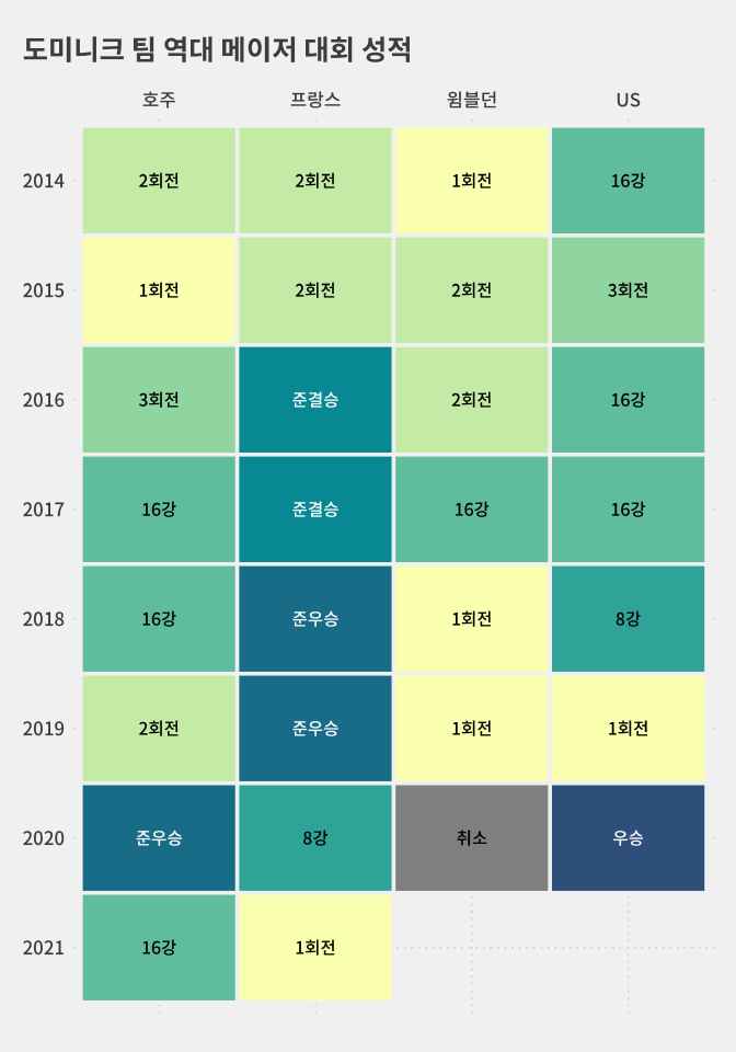 결국 팀은 8강에서 '작은 거인' 디에고 슈와르츠만(29·아르헨티나·당시 14위)에게 패하면서 메이저 대회 연속 우승에 실패하고 말았습니다.