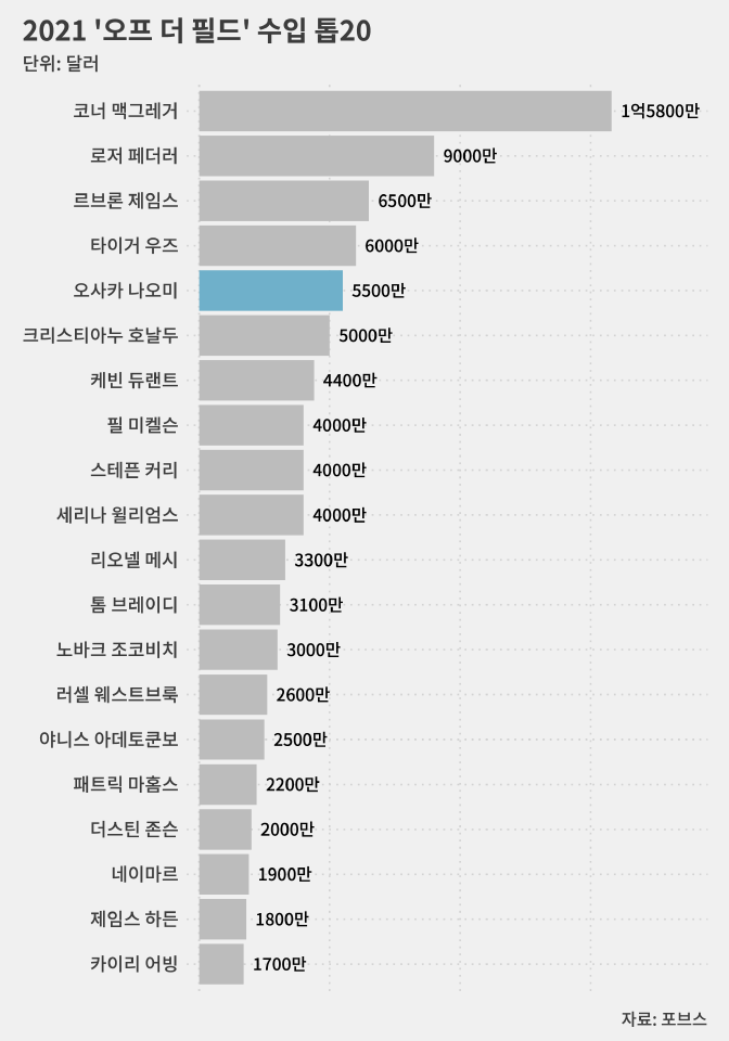 지난해 오사카보다 오프 더 필드 수입이 더 많은 건 △코너 맥그레거(33·종합격투기) △로저 페더러(40·테니스) △르브론 제임스(37·농구) △타이거 우즈(46·골프)뿐이었습니다.