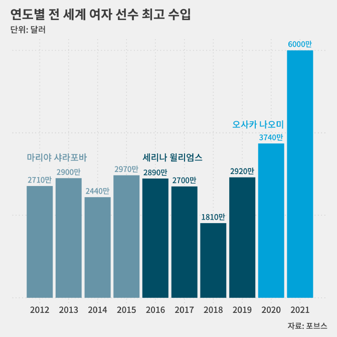 포브스는 오사카가 지난해 5월부터 1년 사이에 총 6000만 달러(약 670억 원)를 벌었다고 추산했습니다.