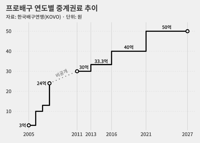이럴 때는 중계권료를 비공개로 하는 게 당연한 일. 그래서 정확한 금액은 알 수 없지만 연 평균 50억 원 정도가 정설로 통합니다.