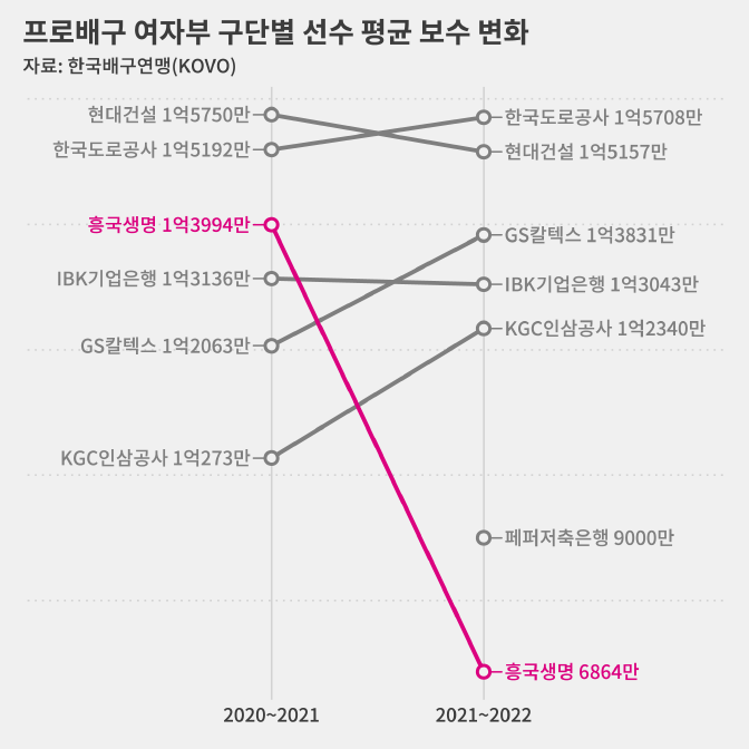 이러면서 흥국생명 선수단 평균 연봉은 지난 시즌 1억1188만 원에서 5893만 원으로 47.3%가 줄었습니다.