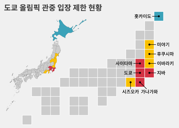 이렇게 도도부현(都道府県) 숫자로 따지면 무관중과 유관중을 4대4로 나눈 것 같지만 전체 42개 경기장 가운데 34개(81%)가 수도권 4개 지자체에 몰려 있기 때문에 이번 올림픽은 무관중에 더 가깝습니다.