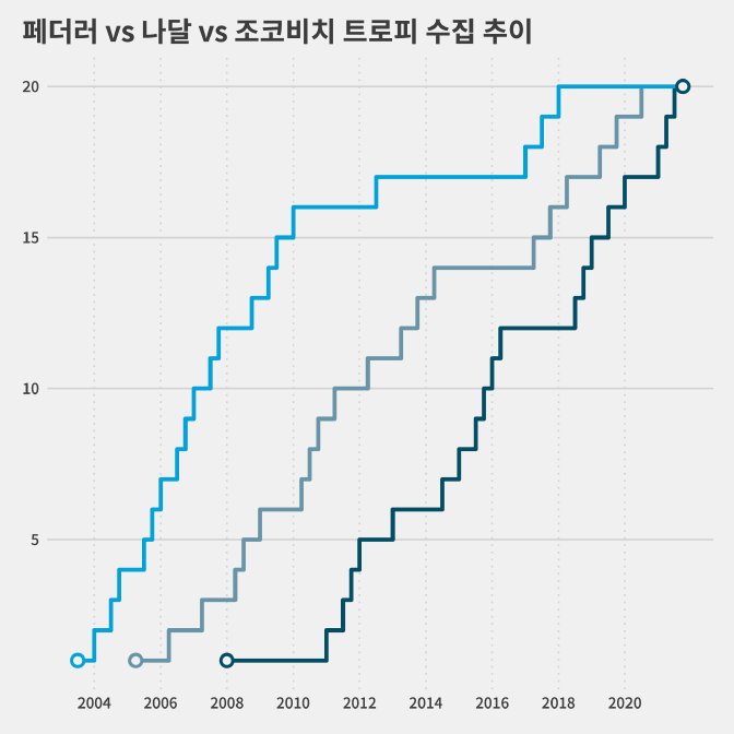 페더러가 2003년 윔블던에서 생애 첫 메이저 대회 우승을 차지한 뒤 메이저 대회를 71번 치르는 동안 60번(84.5%)은 세 선수가 남자 단식 주인공이었던 겁니다.