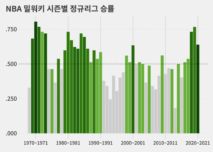 밀워키는 첫 우승을 차지한 1970~1971 시즌부터 1990~1991 시즌까지는 21년 동안 18번 '봄 농구' 무대를 발았던 플레이오프 단골 손님이었습니다.