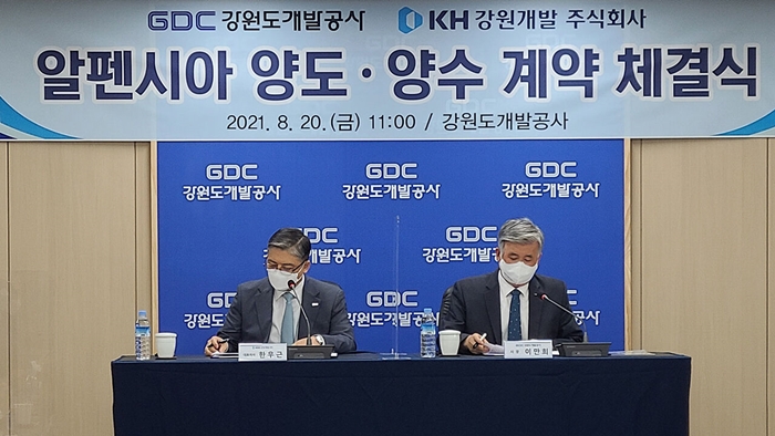 강원도개발공사와 KH강원개발은 20일 공사 대회의실에서 알펜시아 리조트 양도·양수 계약을 맺었습니다.
