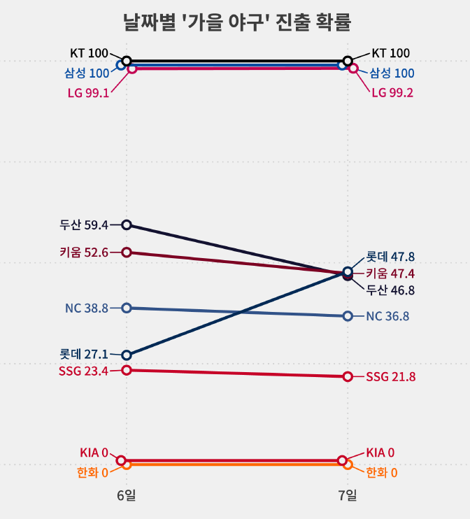 두산은 전날까지 59.4%였던 포스트시즌 진출 확률이 46.8%까지 떨어졌고 키움도 52.6%에서 47.4%가 됐습니다.