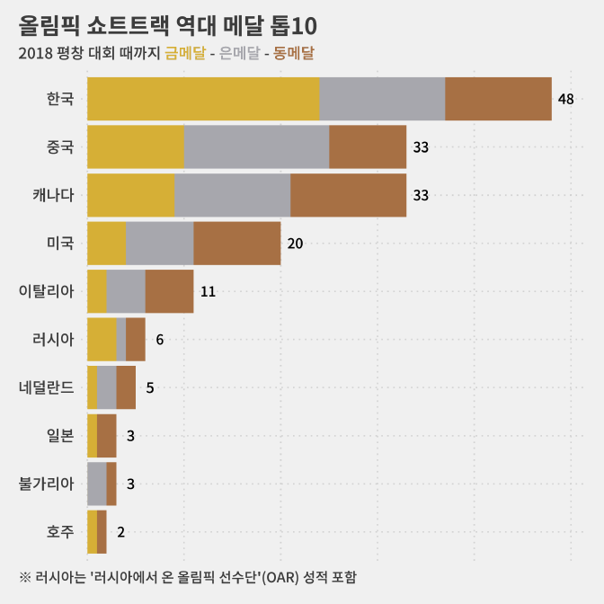 그렇다고 한국이 올림픽 때마다 쇼트트랙에서 제일 성적은 거둔 건 아닙니다.