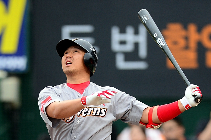 대전구장에서 본인이 친 타구를 바라 보는 최정. 동아일보DB