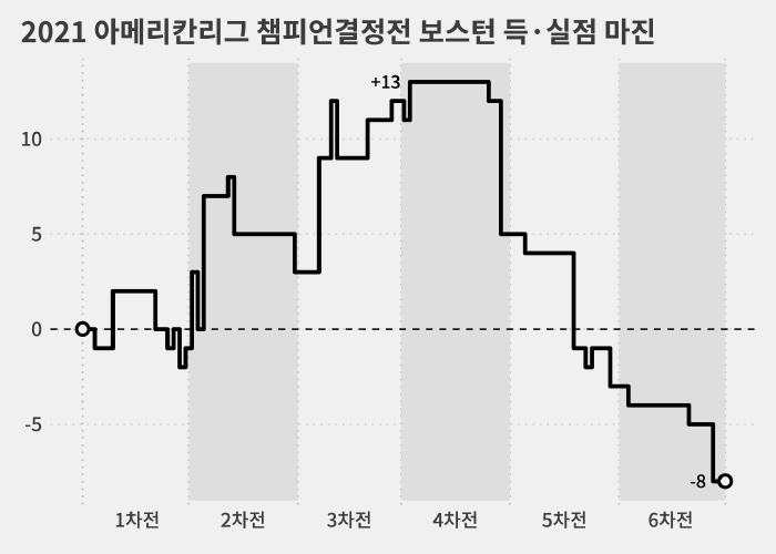 이보다 큰 점수차를 뒤집은 건 보스턴이 1999년 AL 디비전시리즈(DS) 때 1, 2차전에서 -11이었던 득·실점 마진을 3, 4차전에서 +22로 바꾼 딱 한 사례밖에 없습니다.