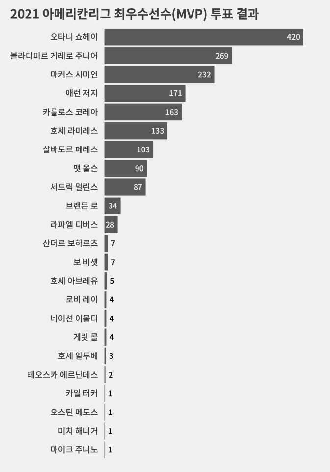 유일한 AL MVP 투표 관전 포인트가 있다면 어떤 모양새로 오타니가 타이틀을 가져가느냐 하는 것.