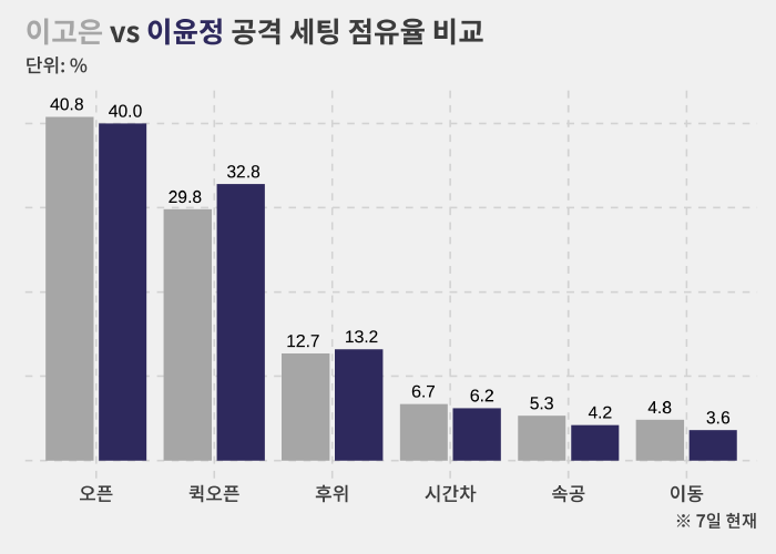 사실 이윤정이 통계적으로 이고은과 굉장히 다른 공격 옵션을 선택한다고 보기는 어렵습니다.