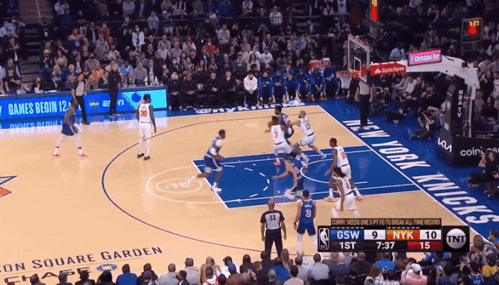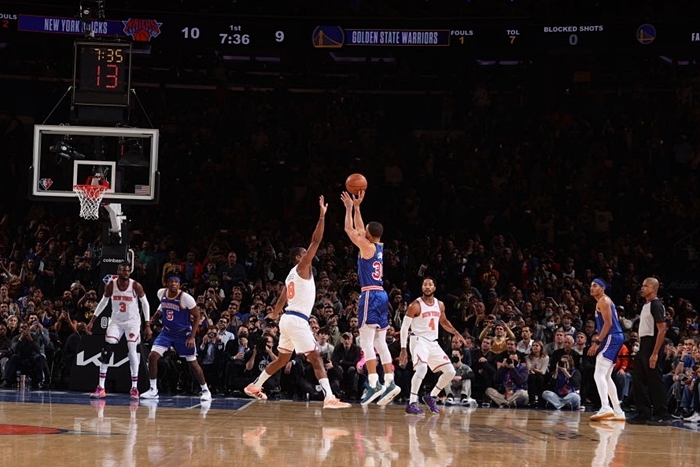 커리는 14일(이하 현지시간) 뉴욕 매디슨 스퀘어 가든에서 열린 2021~2022 NBA 방문 경기에서 1쿼터 종료 7분 33초를 남겨두고 28피트(8.5m)짜리 3점슛을 성공시켰습니다.