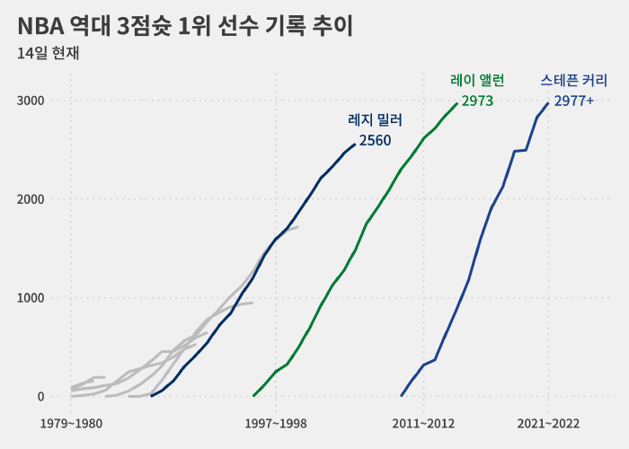 당시 2562번째 3점슛을 성공하면서 레지 밀러(56·인디애나)를 넘어선 레이 앨런(46·당시 보스턴)은 결국 3점슛을 2973개 성공한 뒤 유니폼을 벗었습니다.