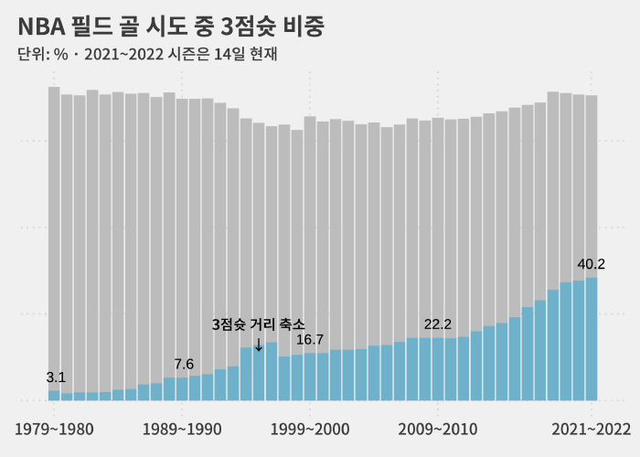 커리가 등장하기 전부터 3점슛이 늘어나는 추세였던 건 사실.