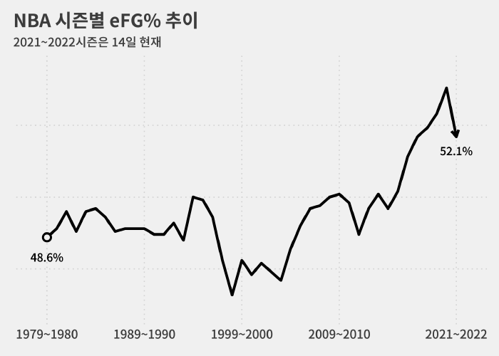 지난 시즌 53.8%에서 이번 시즌 52.1%로 떨어지는 듯했지만 필드골 효율(eFG%)로 보면 이렇게 3점슛을 많이 던지는 게 나쁜 선택이라고 볼 수도 없습니다.