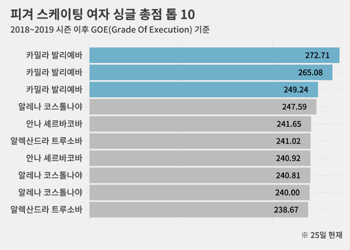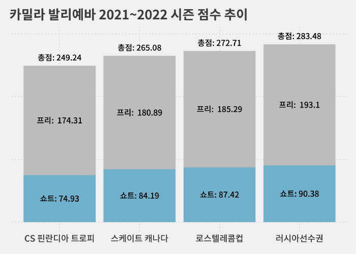 발리예바는 지난달 28일 끝난 2021~2022 ISU 피겨 시니어 그랑프리 6차 대회 '2021 로스텔레콤컵'에서 272.71점을 받으면서 여자 선수로는 처음으로 270점을 넘겼습니다.