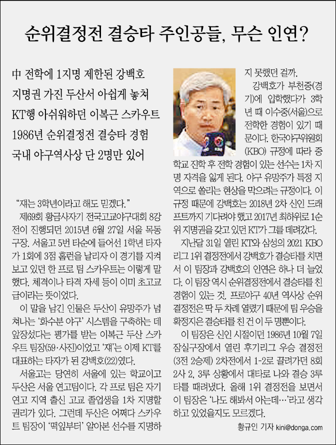 이어 "두산의 상장인 화수분 야구의 기틀을 닦았고 외국인 선수 영입 과정에서도 혁혁한 공을 세웠다"고 평가했습니다.