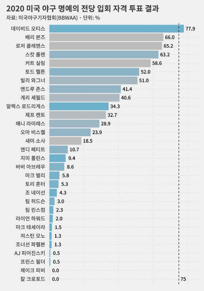 후보자 명단에 10년 이상 이름을 올렸는데도 득표율 75%를 기록하지 못하면 기자단 투표 대상에서 빠집니다.