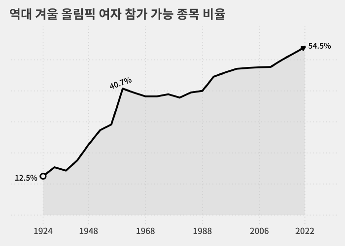 제1회 겨울 올림픽이었던 1924년 샤모니 대회 때는 전체 참가 선수 258명 가운데 13명(5.0%)만 여자 선수였습니다.