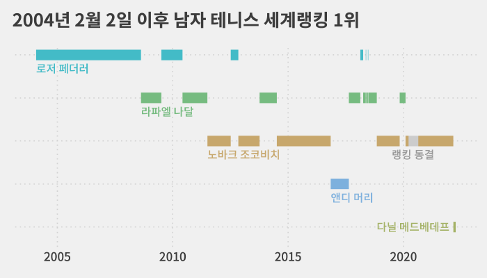 페더러가 처음 랭킹 1위에 오른 2004년 2월 2일 이후로도 사실 마찬가지입니다.