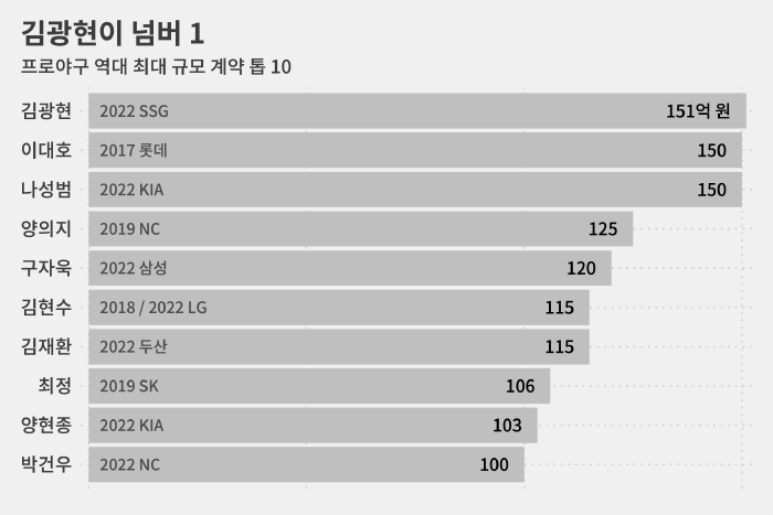이전까지는 이대호(40)가 2017년 롯데와 나성범(32)이 지난해 KIA와 150억 원에 계약한 게 공동 1위 기록이었습니다.