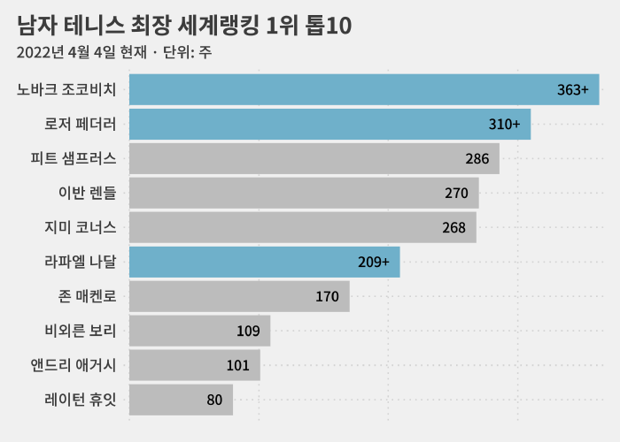 ATP에서 21일자 랭킹을 발표하면 조코비치는 본인이 보유하고 있는 역대 최장 1위 기록을 최소 363주까지 늘리게 됩니다.