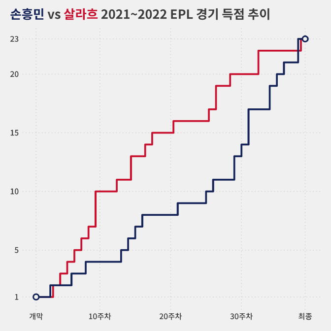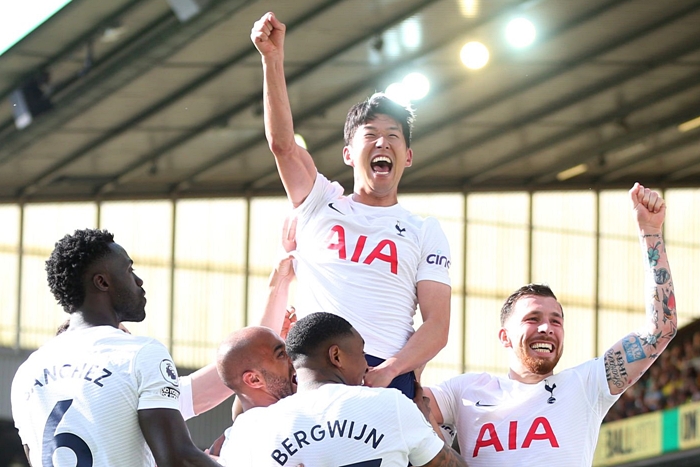 손흥민은 2021~2022 EPL 팀 마지막 경기였던 22일(이하 현지시간) 노리치 방문 경기에서 후반 25분에 첫 골(시즌 22호)을 넣은 뒤 5분 뒤에도 골망을 흔들었습니다(시즌 23호).