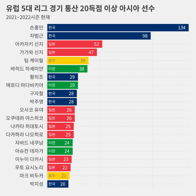 사실 커리어 기준으로 이 5개 리그 경기에서 20골 이상 넣은 아시아 선수는 20명밖에 되지 않습니다.