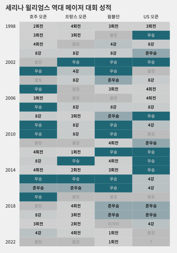 단, 아마추어 시절까지 따지면 마거릿 코트(80·호주)가 24회(아마추어 시대 13회, 오픈 시대 11회)로 메이저 대회 우승이 한 번 더 많습니다.