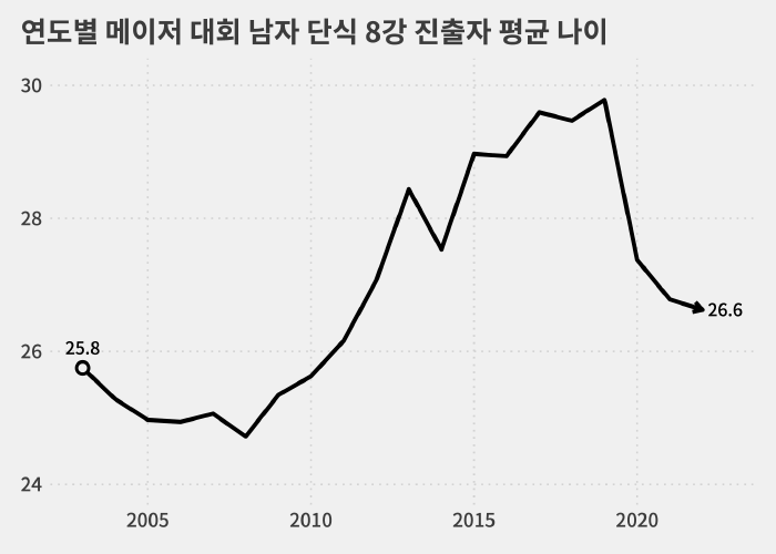 또 올해 메이저 대회 전체 8강 진출자 평균 나이(26.6세)도 2011년(26.2세) 이후 가장 어립니다.