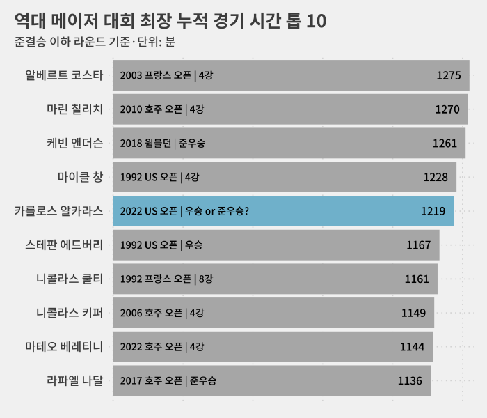 알카라스는 4회전부터 준결승까지 세 경기 연속으로 풀 세트 접전을 치르면서 총 1219분 동안 빌리 진 킹 국립 테니스 센터를 뛰어 다녔습니다.