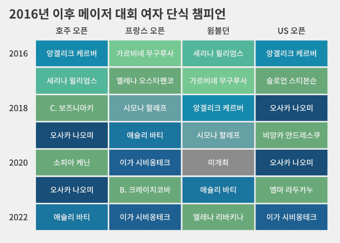 앙겔리크 케르버(34·독일·50위)가 2016년 호주 오픈과 US 오픈 챔피언에 오른 뒤로 매년 메이저 대회 챔피언은 4명이었습니다.