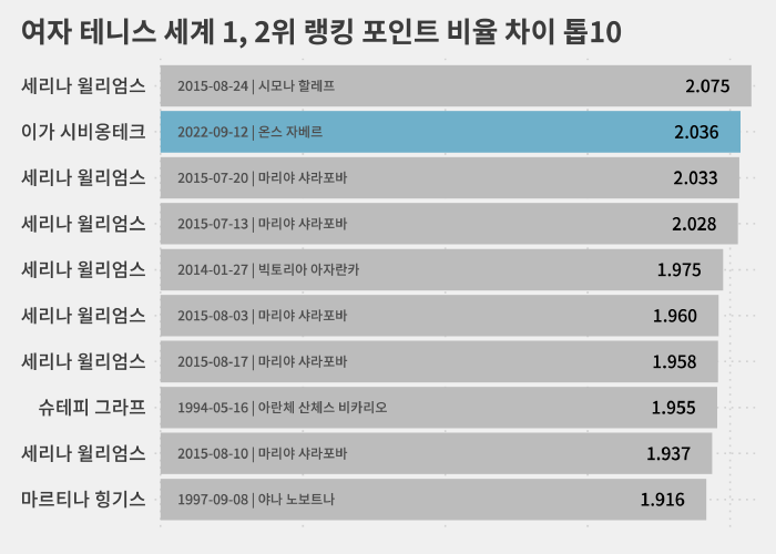 2015년 8월 24일 기준으로 1위였던 윌리엄스(1만2721점)가 2위 시모나 할레프(31·루마니아·6130점)보다 2.075배 높았던 것 다음으로 큰 차이입니다.