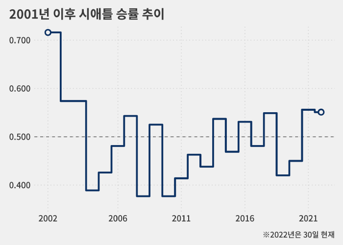 이후 2004년 63승 99패(승률 .389)에 그친 뒤로 본격적인 '암흑기'가 찾아왔습니다.