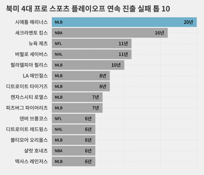 20년 동안 포스트시즌에 진출하지 못한 건 메이저리그뿐 아니라 북미 4대(농구 미시축구 아이스하키 야구) 프로 스포츠를 통틀어서도 최장 기록이었습니다.