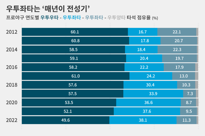 2012년에는 이 비율이 16.7%(6779타석)였으니까 10년 사이에 우투좌타 선수가 2.3배 늘어난 셈입니다.