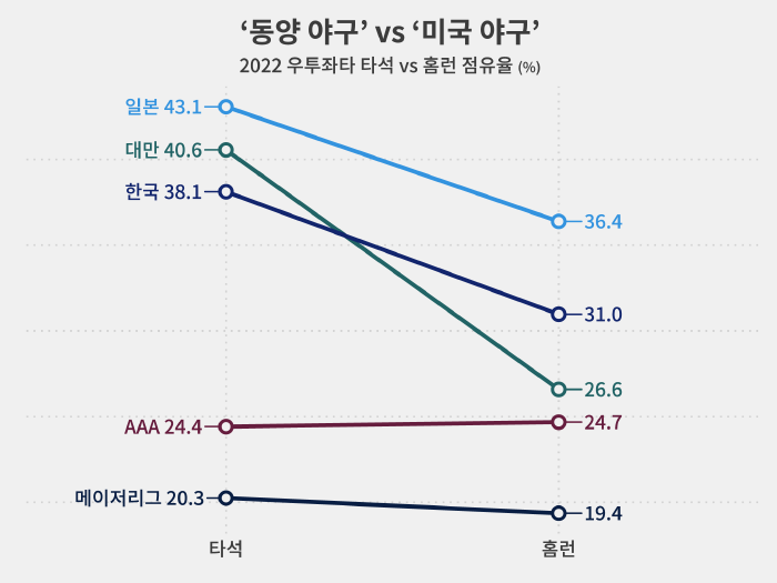 자연스레 왼손 타자 타석 점유율도 39.5%로 한국(50.2%), 일본(51.5%), 대만(48.7%)보다 낮았습니다.