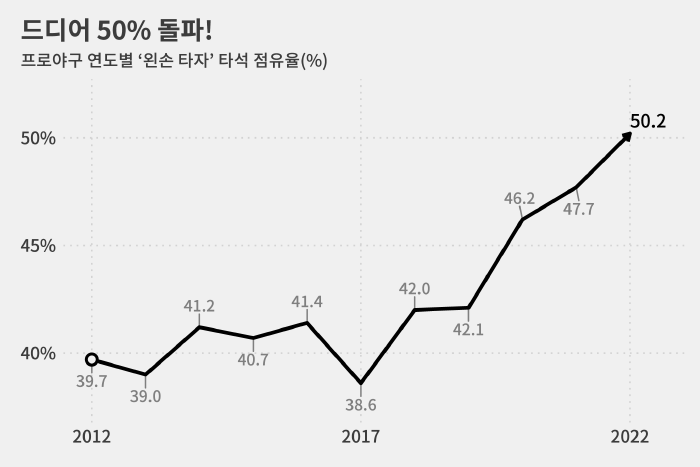 지금으로부터 10년 전인 2012년만 해도 왼손 타자 점유율은 39.7%가 전부였습니다.