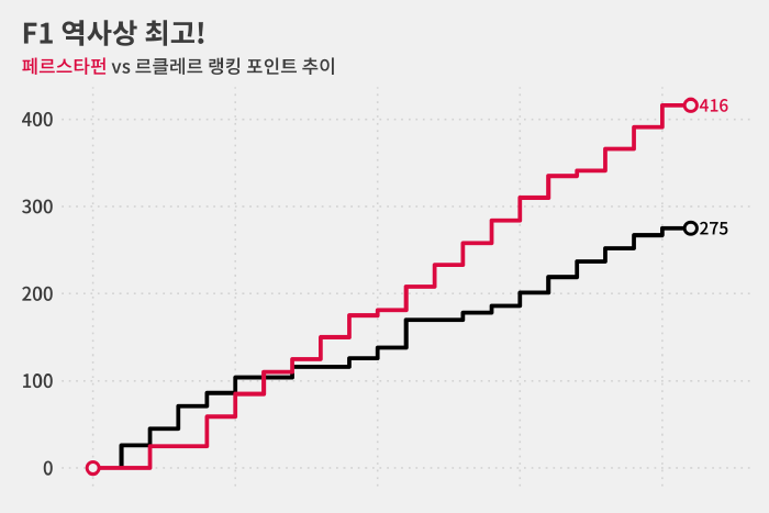 페르스타펀은 이날 시즌 랭킹 포인트를 416점으로 끌어올리면서 루이스 해밀턴(37·영국·메르세데스)이 2019년 남긴 종전 기록(413점)도 넘어섰습니다.